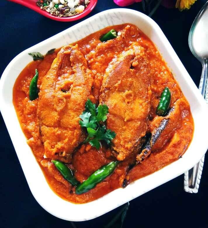 Bhekti Kalia is a classic Bengali delicacy where soft Bhekti fish is cooked in a rich, mildly spicy onion-tomato gravy with aromatic spices.