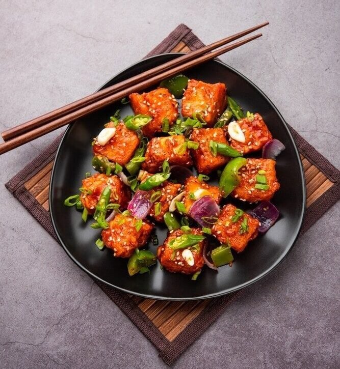 Golden fried paneer tossed with onions, capsicum, and spicy chilli sauce 😋 A perfect dry starter for Indo-Chinese lovers ✨