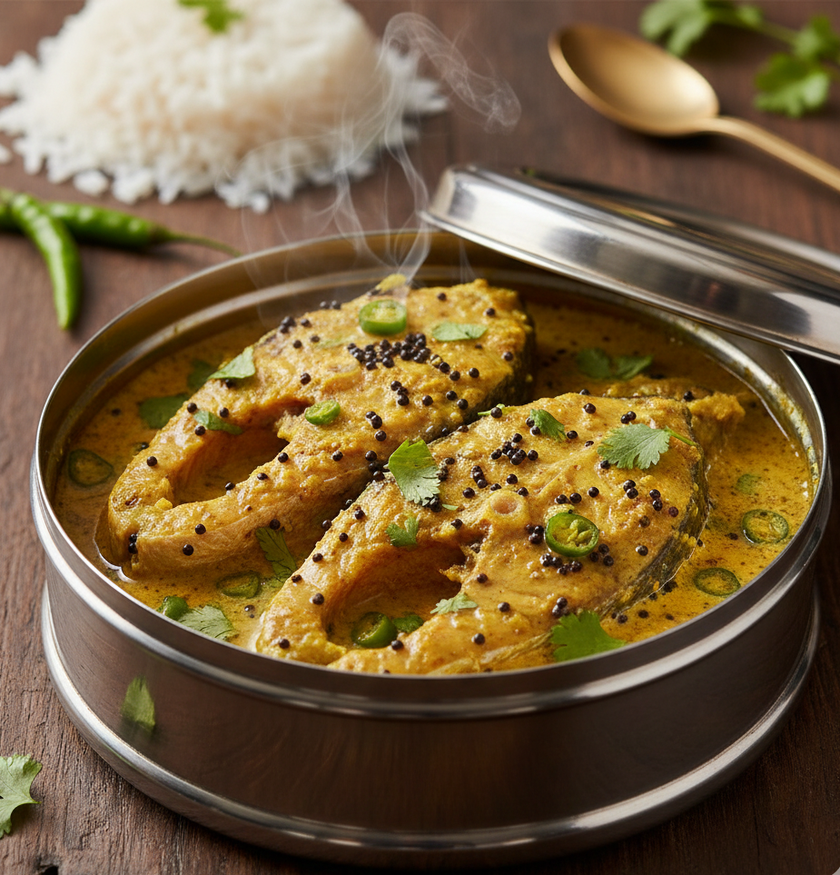 Tangy Bengali Katla fish curry with dry mango.