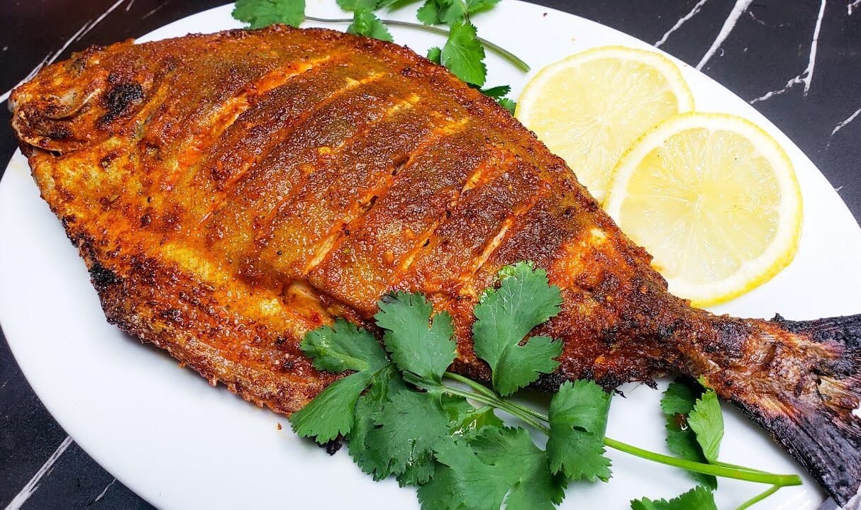 Large Pomfret Masala Fry is a whole pomfret marinated in rich spices and shallow-fried until crisp and full of flavor.