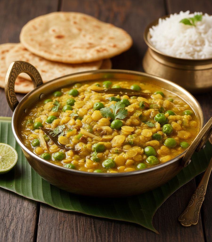 Yellow lentils cooked with fresh green peas in a light, comforting gravy.