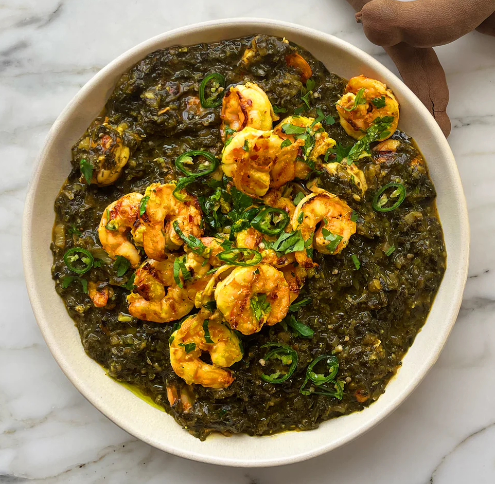 Healthy Bengali-style prawn curry with leafy greens.