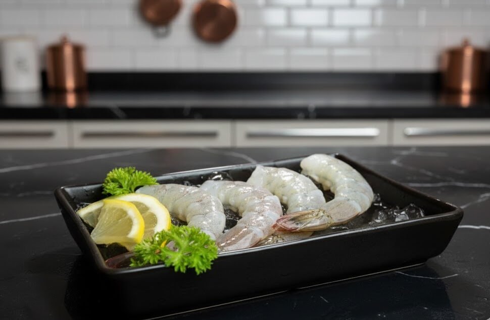 Fresh raw Tiger Prawns sourced for their large size, firm texture, and natural sweetness.